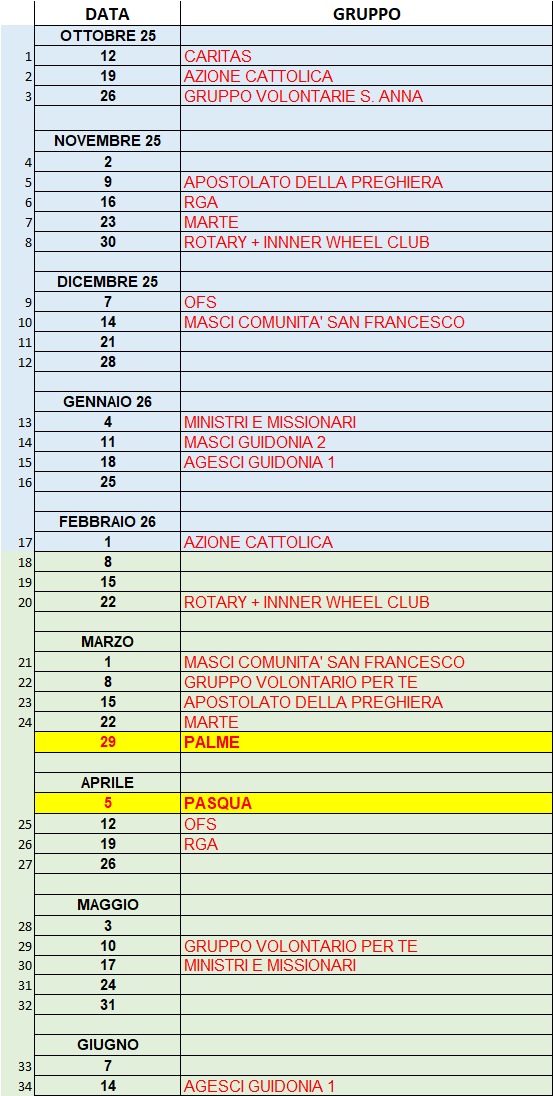 Di seguito viene elencata la Turnazione del Servizio Mensa, i responsabili di ogni turno, con qualche giorno di anticipo prendano contatto con il Referente (delegato dal Parroco) e/o la segreteria parrocchiale per stabilirne i dettagli tecnici.